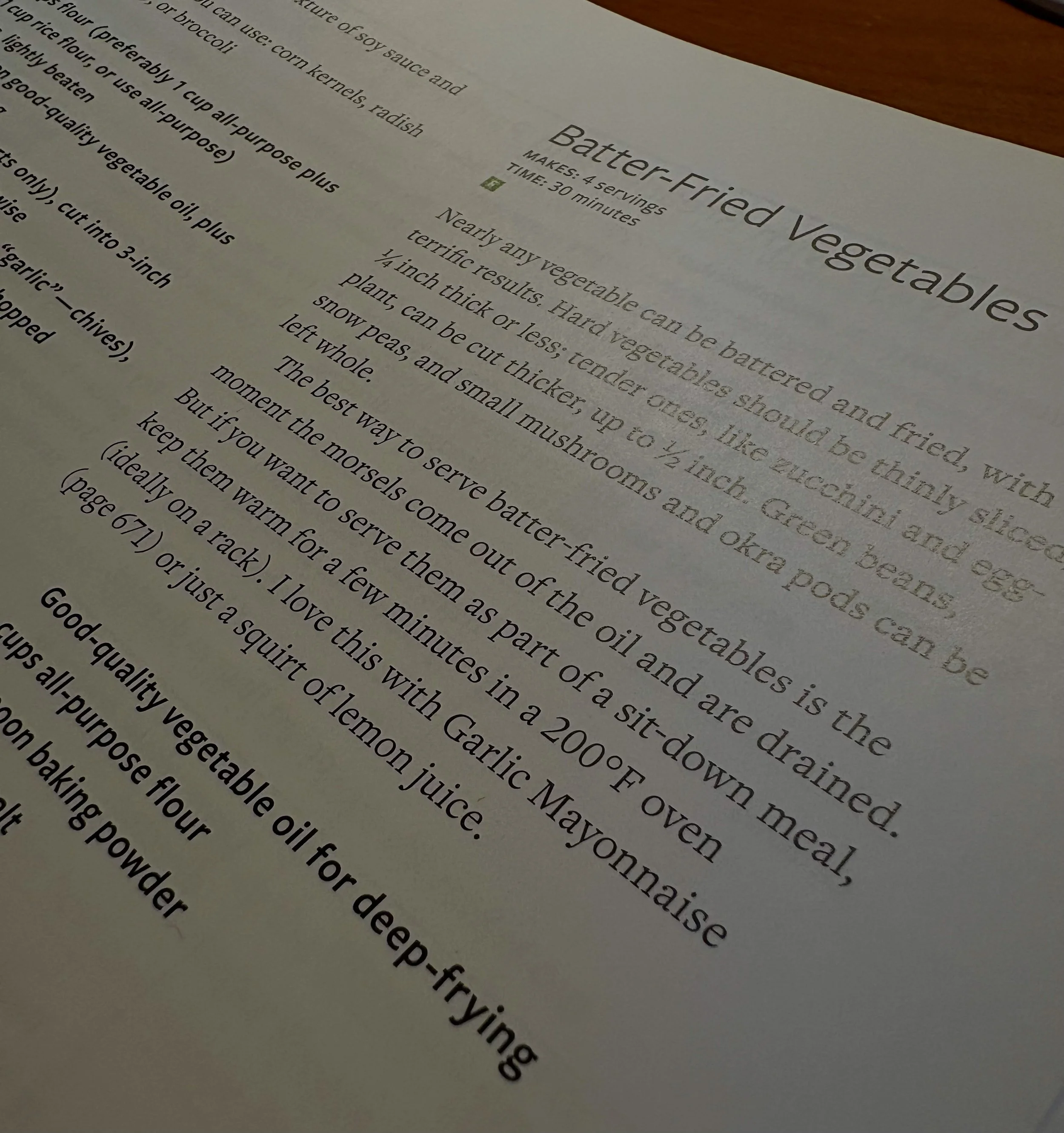Batter Fried Vegetables— This recipe is another example of customizable but informative providing all the information on how to cook and season but giving you creativity to choose the veggies.