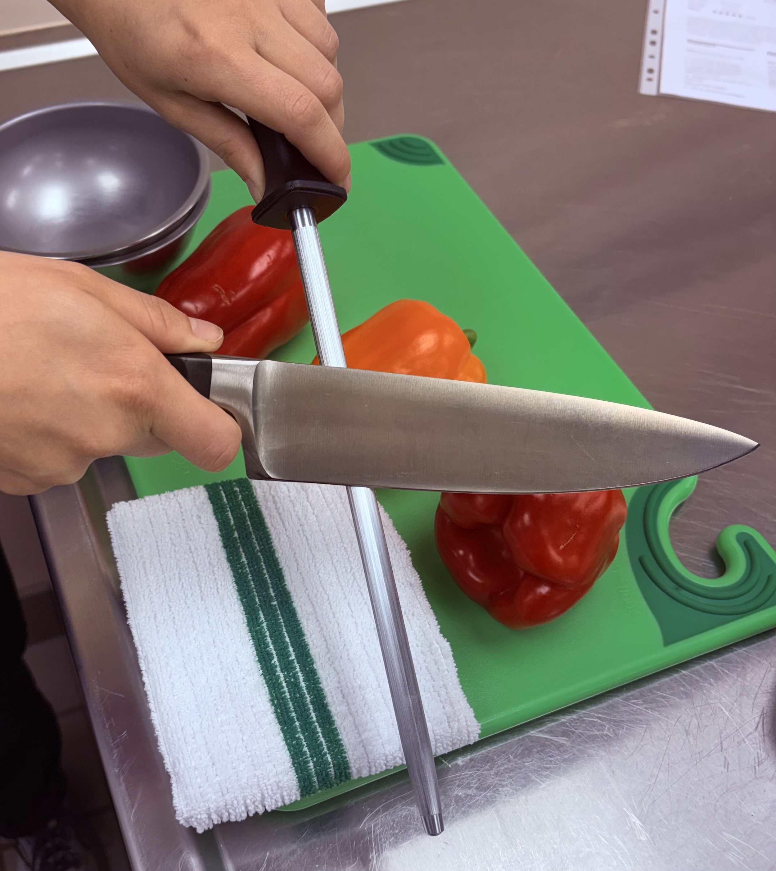 If your cutting board does not stay stuck to the counter a helpful trick is to put a clean wet dish towel under it. Before you begin to cut with your knife it is always a good habit to use a hone on your knife to clean the blade to help it cut smoother through your ingredients.